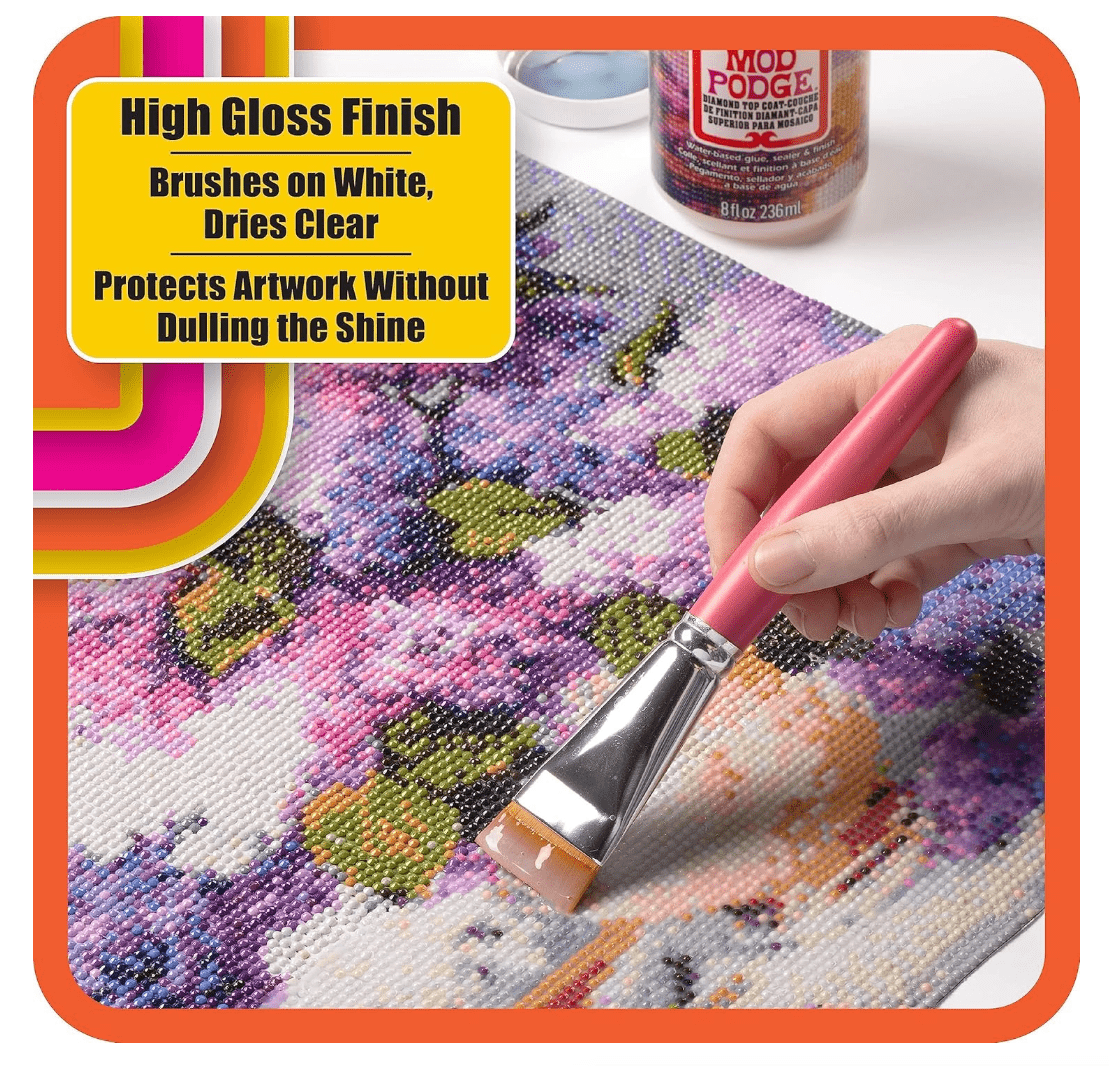 Plaid Mod Podge Diamond Top Coat Acrylic Sealer 8oz. Protect your sparkle. Left unsealed, diamonds can loosen and fall off over time. Brush-on formula helps preserve diamond art for posterity. Seals and protects without dulling the shine, clear, high-gloss, top-coat. Indoor use only. This package contains one 8oz bottle of diamond top coat mod podge.